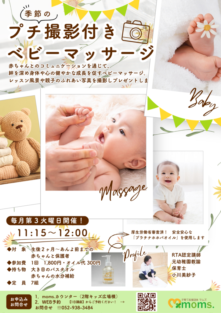 講座一覧 【未就園児(0~3歳)対象】 講座には「習い事」と「1日講座」の2種類があります。 ①「習い事」とは月謝制、月3回の講座です。 ②「1日講座」とは単発、もしくは複数回(一括払い)の講座です。 ※画像をクリックすると講座の詳細がご覧いただけます 習い事 (月)親子リトミック (火)みんなのフラ 1日講座 (火)ベビトレヨガ (火)プチ撮影付きベビーマッサージ (金)産後リカバリーヨガ